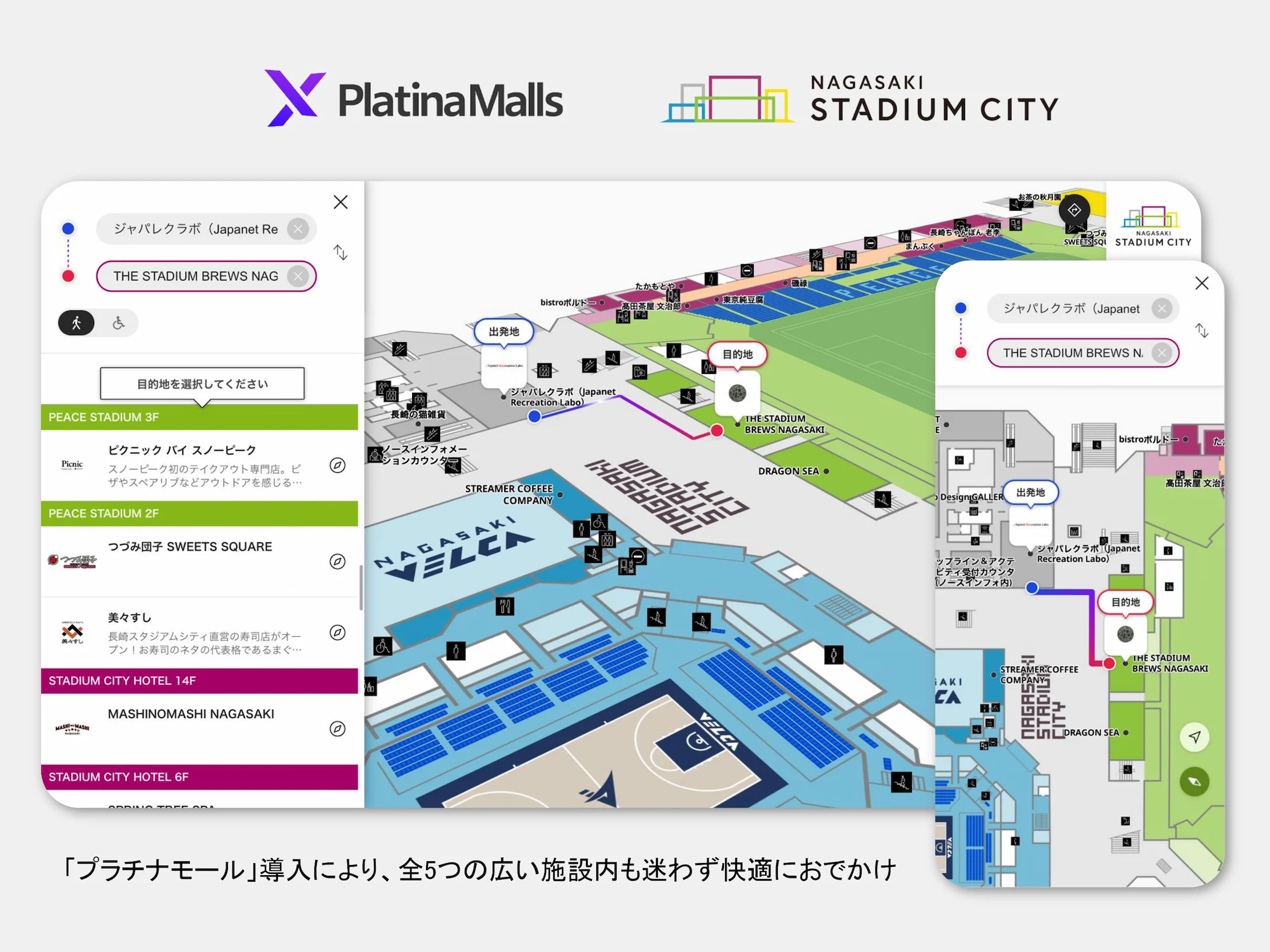 ボールドライト株式会社(本社:東京都新宿区、代表取締役社長:宮本章弘、以下、ボールドライト)が提供するデジタルフロアマップ・プラットフォーム「プラチナモール」を利用して作成した、長崎スタジアムシティのデジタルマップが、2024年10月14日に公開されます。長崎スタジアムシティはサッカースタジアム、アリーナ、ホテル、ショッピングモール、オフィスなどの大型複合施設で、全5つのエリア情報をデジタルマップにし、施設内の経路検索が可能です。
