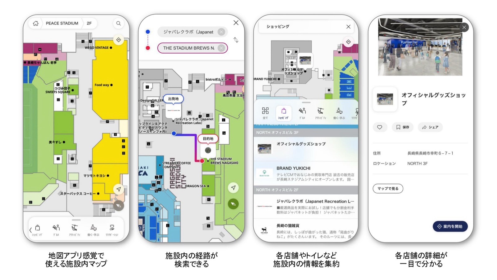 デジタルフロアマップ・プラットフォーム「プラチナモール」を活用して、長崎スタジアムシティ全5つのエリア内における各店舗、トイレ、駐車場などの情報を掲載したデジタルマップが開業日の10月14日に公開されます。今回作成されたデジタルマップは各店舗等の情報が画像ピンで表示されるため、広大な施設内に何があるか一目で分かり、行きたい場所をすぐに見つけ、迷う事なく施設内を楽しめます。