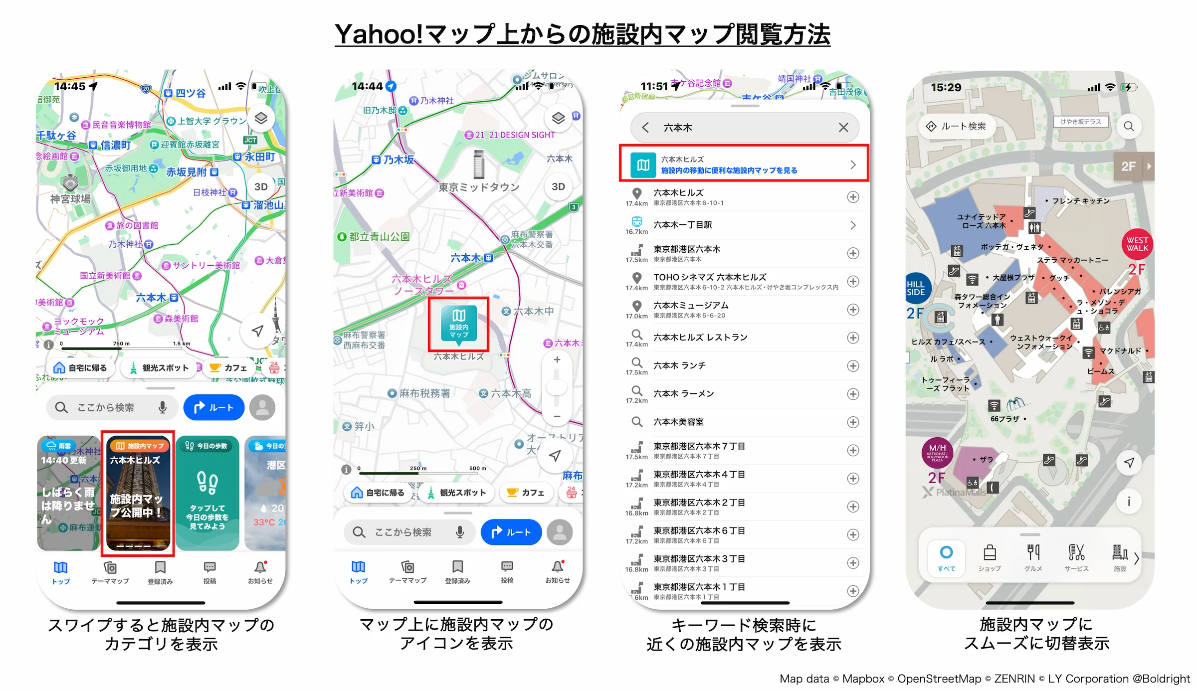 デジタルマップによるDXを推進するスタートアップ、ボールドライト株式会社(本社:東京都新宿区、代表取締役社長:宮本章弘、以下、ボールドライト)はLINEヤフー株式会社(本社:東京都千代田区、代表取締役社長 CEO:出澤剛、以下、LINEヤフー)が提供する無料地図アプリ「Yahoo! マップ」と提携し、屋外と施設内におけるデジタルマップの分断を解消するため、開発する「プラチナマップ・プラットフォーム」で作成された全国各地の施設内デジタルマップを「Yahoo!マップ」上で提供する実証実験を開始しました。
