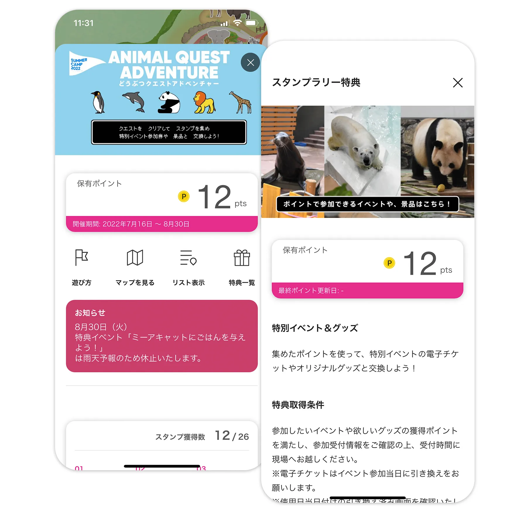また、動物の餌やりなど⼈数制限や時間制限がある特典は事前にその旨を掲載しておき、終了した場合はすぐにリアルタイム更新することで、その場まで来て参加できなく悲しい思いをするお客様をなくすこともできたため、お客様満⾜度も上げることができたと思います。